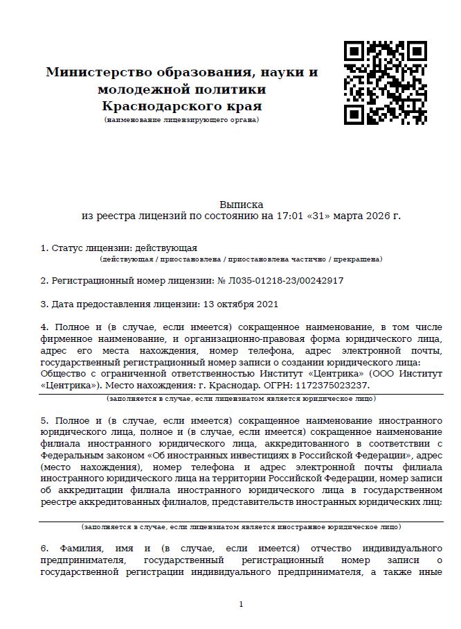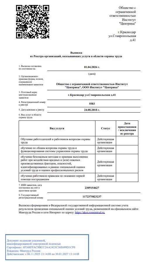Учебный центр ООО Институт "Центрика" получил лицензию на ведение образовательной деятельности № Л035-01218-23/00242917. В соответствии с требованиями законодательства РФ компания внесена в Реестр организаций, оказывающих услуги по охране труда № 5583.
